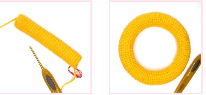 Wir schlagen eine Kette von 17 Lm mit gelbem Garn (Nr. 35) an, schließen sie zu einem Ring und häkeln eine Art Rohr in einer Spirale. Füllung dabei. In regelmäßigen Abständen probieren wir unsere pralle Taille auf die gewünschte Länge an und verbinden den Kreis. Es stellte sich heraus, dass mein Teil etwa 28-29 cm groß war.