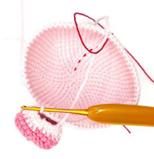 Runde 13: 1 feste Masche, zur Hälfte falten, 6 feste Maschen auf beiden Seiten des Ohrs häkeln