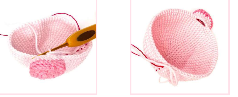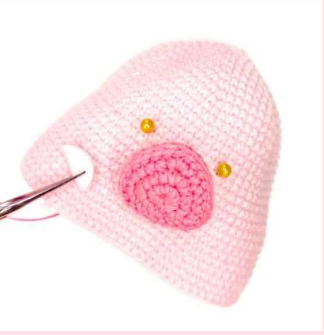 Befestigen Sie beide Kanten der Lippe mit dem zweiten Fadenstück. Wir machen Stiche nach oben und hinten. Wir bringen es an die Stelle, an der die Nase gebunden ist (zwischen 18 und 19 Runden). Dank der Kordelzüge sind sie dort unsichtbar.