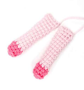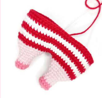 Beim häkeln stopfen wir den Körper fest aus. Wir befestigen die rote Farbe des Badeanzugfadens Nr. 90 und schneiden den rosa ab. Wir häkeln eine Kette aus 3 Ketten und verbinden die Beine.