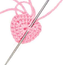 Lassen Sie ein Stück Faden ca. 30 cm übrig, stecken Sie 6 feste Maschen in den KA und ziehen Sie ihn ab. Lassen Sie eine Länge von ca. 40-45 cm übrig, schneiden Sie den Faden ab. Wir haben ein Teil erhalten, dessen Form einem Halbkreis ähnelt. Wir probieren das Teil an, befestigen es im Abstand von 2-3 Runden nach unten vom Mund festziehend. Wir fixieren die Lippenmitte etwas unterhalb der Ränder. Beim Nähen sollte die Fadenspannung moderat sein. Nicht zu fest anziehen. Wir führen den Mittelfaden (der beim Anschlagen von Schlaufen im KA übrig bleibt) an einer beliebigen Stelle im Rundenabstand von der Mitte des KA zum Hinterkopf und machen einen Stich durch die Runde bis zur Mitte des KA im Inneren des Kopfes . Sie können es noch einmal wiederholen. Wir machen den Stich fest, ziehen ihn aber nicht fest. Wir verstecken den Faden mit mehreren Wirrstichen im Inneren des Spielzeugs.
