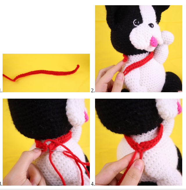 Reihe 1: 35 Luftmaschen (oder so viele Luftmaschen, bis die Luftmasche um den Hals des Spielzeugs passt). Häkle eine feste Masche in die 2. Luftmasche von der Nadel aus. Häkle eine feste Masche in die restlichen 33 Luftmaschen (34). Beende den Vorgang, lasse aber einen Faden zum Annähen übrig. Lege den Streifen wie gezeigt um den Hals des Spielzeughundes (Bild 2). Die Enden des Streifens treffen sich wie gezeigt. Nähe die Enden mit dem restlichen Faden zusammen (Bild 3-4). Vernähe die Enden anschließend.