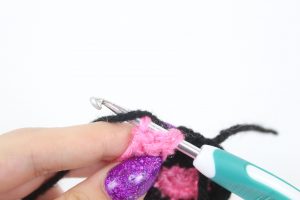 Wiederholen: Zu Rosa wechseln, 3 x Doppelmasche in die nächste M (Bild 1). Nadel aus der aktuellen M nehmen und in die erste Doppelmasche einstechen (Bild 2). Nun die Nadel auch in die aktuelle Arbeitsschlaufe einstechen (Bild 3). Den Faden mit der Hauptfarbe (Bild 4) überziehen und durch beide Maschen ziehen (Bild 5-6). Das ergibt 1 Popcorn-Masche. Nun mit der Hauptfarbe weiterstricken, in die nächste Masche (Bild 7) 3-mal aufnehmen, in die nächsten 7 Maschen eine feste Masche häkeln (23)