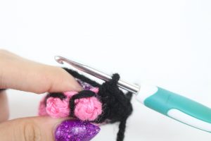Runde 6: Die nächsten 7 M festmaschen. Festmasche über die nächste Popcorn-Masche, Festmasche in die nächsten 2 M 3-mal wiederholen, Festmasche in die nächsten 7 M.