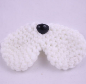 Beenden Sie die Arbeit und lassen Sie einen langen Faden zum Annähen übrig. Setzen Sie eine 12 mm Sicherheitsnase wie abgebildet in die obere Mitte der Mundmaske (Bild 9). Nähen Sie die restlichen Maschen zu (Bild 10). Stecken Sie die Maske wie abgebildet unterhalb der Augen auf den Hund (Bild 12). Nähen Sie die Maske an und vernähen Sie die Enden.